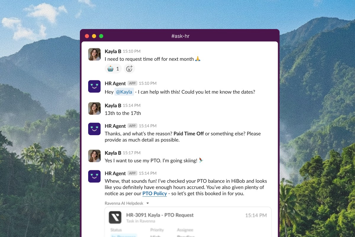 A new User Lookup tool supports conversational collection by searching for users by name or email within your organization. When a requester references someone by name, the agent resolves the mention to a Ravenna user ID to populate user selection fields in forms.