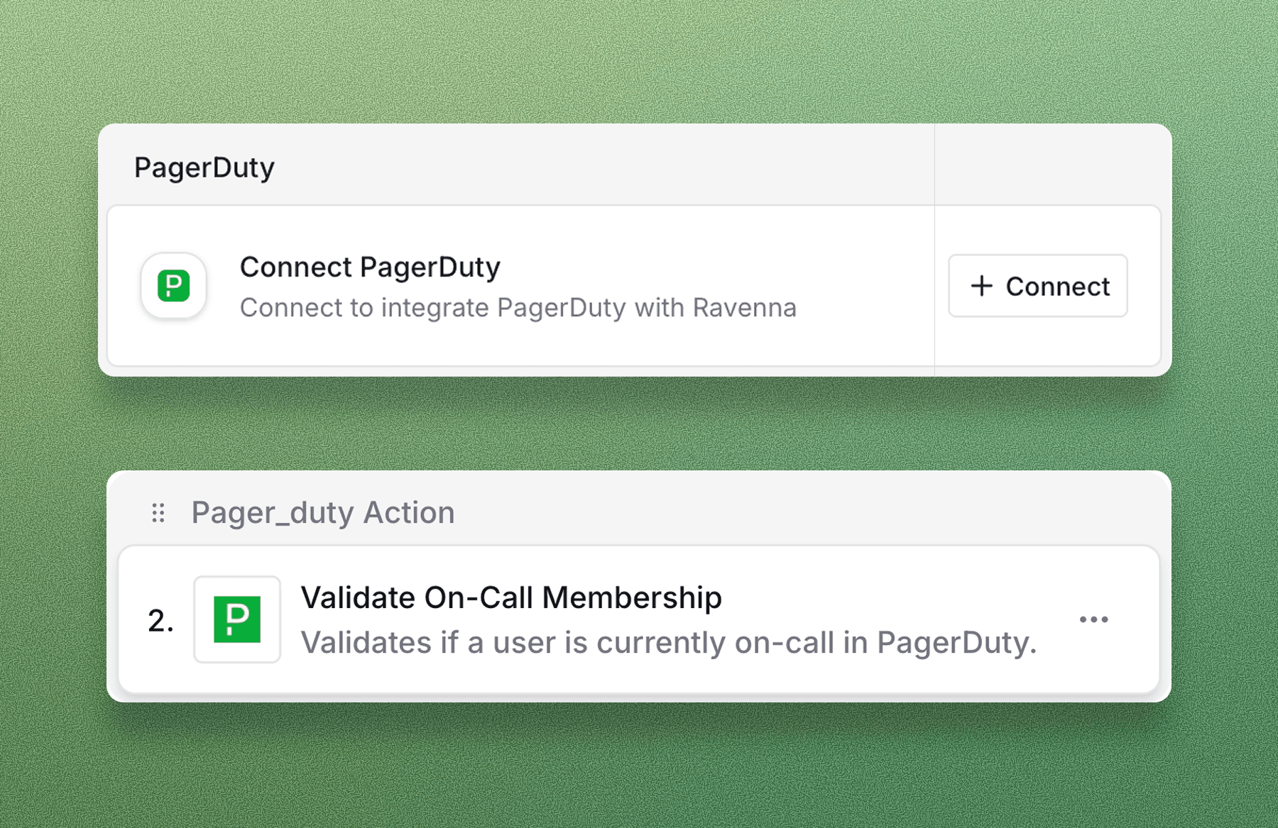 Earlier this year, we launched our Incident.io integration to help teams validate on-call coverage inside Ravenna workflows. Today, we’re extending that capability with a new PagerDuty integration. Teams can now confirm who is (and isn’t) on-call directly within a workflow, streamlining access requests and reducing bottlenecks for time-sensitive operations.