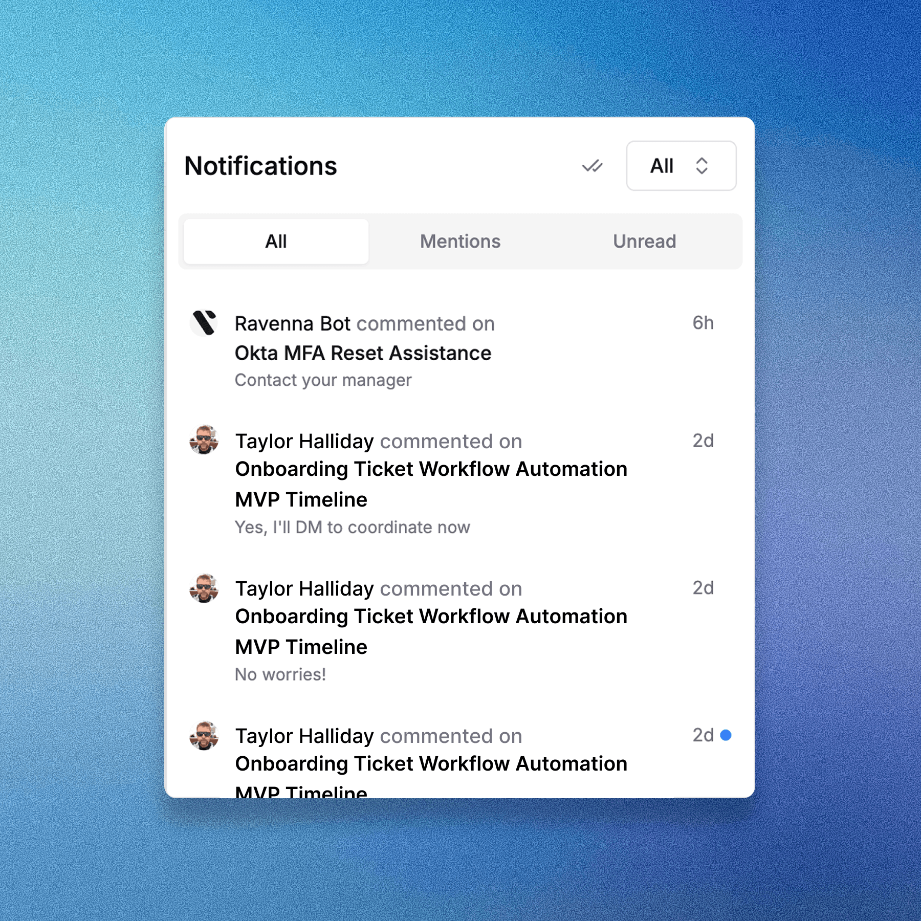 The Notification Center provides a single, consolidated view of all actionable events in Ravenna. It helps teams stay on top of approvals, requests, and updates without switching between different surfaces.