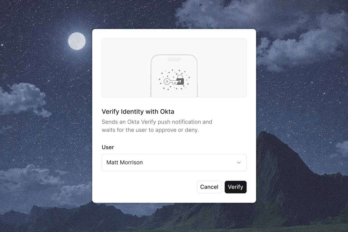 A new Verify Identity with Push action sends an Okta Verify push notification to a user and waits for their response. The action supports if/else branching so workflows can follow different paths depending on whether the user approves or denies. Require step-up verification before granting access to sensitive resources, confirming high-risk changes, or completing privileged operations.