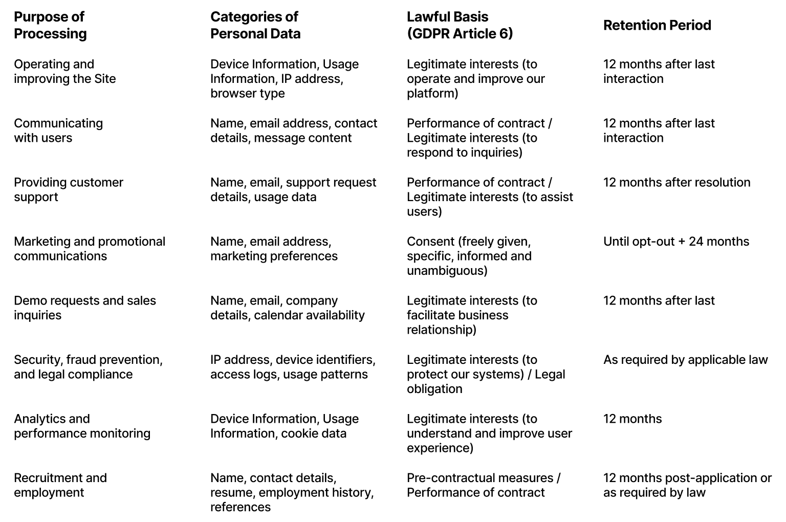 We only process personal data where a lawful basis applies under Article 6 GDPR. The table below shows common purposes, data, and the lawful basis relied upon.