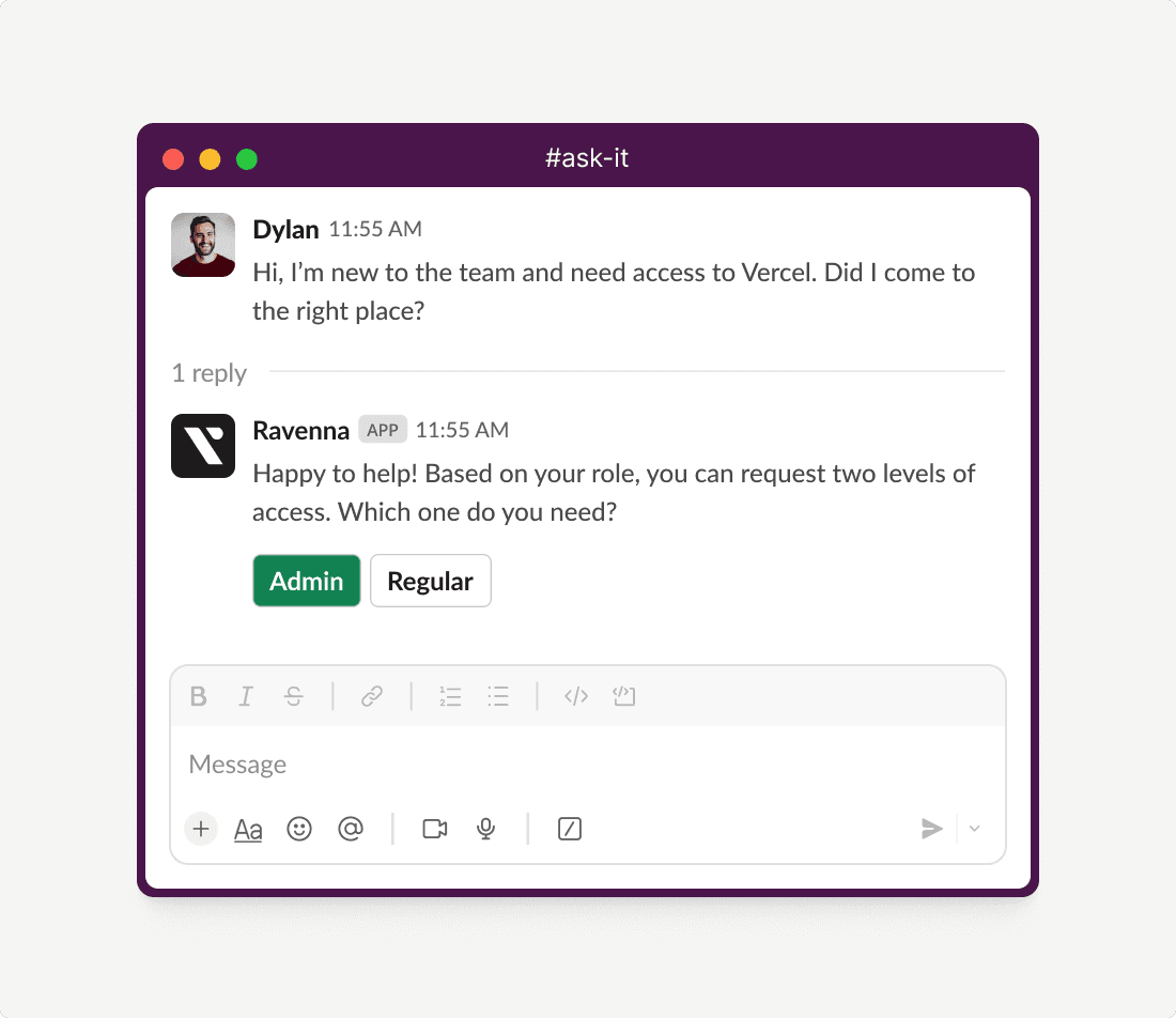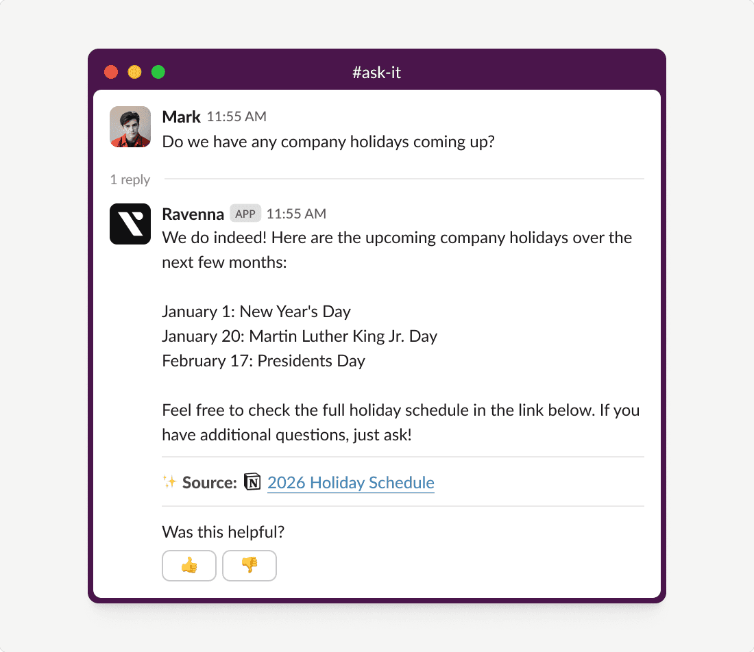 Ravenna is an agentic help desk that lives in Slack, not another portal your team ignores. All of your people, context, and tools in one place.